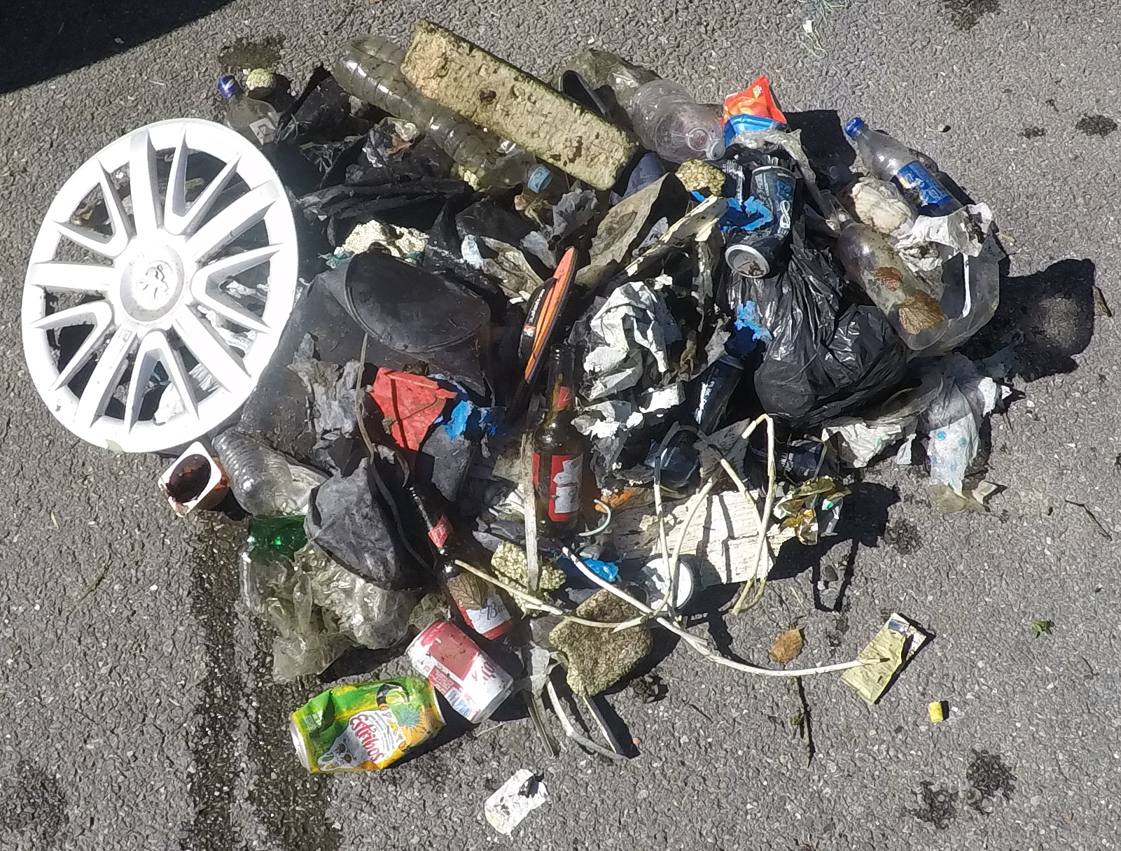 Nid de déchets.Silencieux de pot d’échappement.Ceinture de sécurité.Plastique et tissu bien enchevêtrés.Tôle.Enjoliveur.Bouteille.Retour bien chargé.