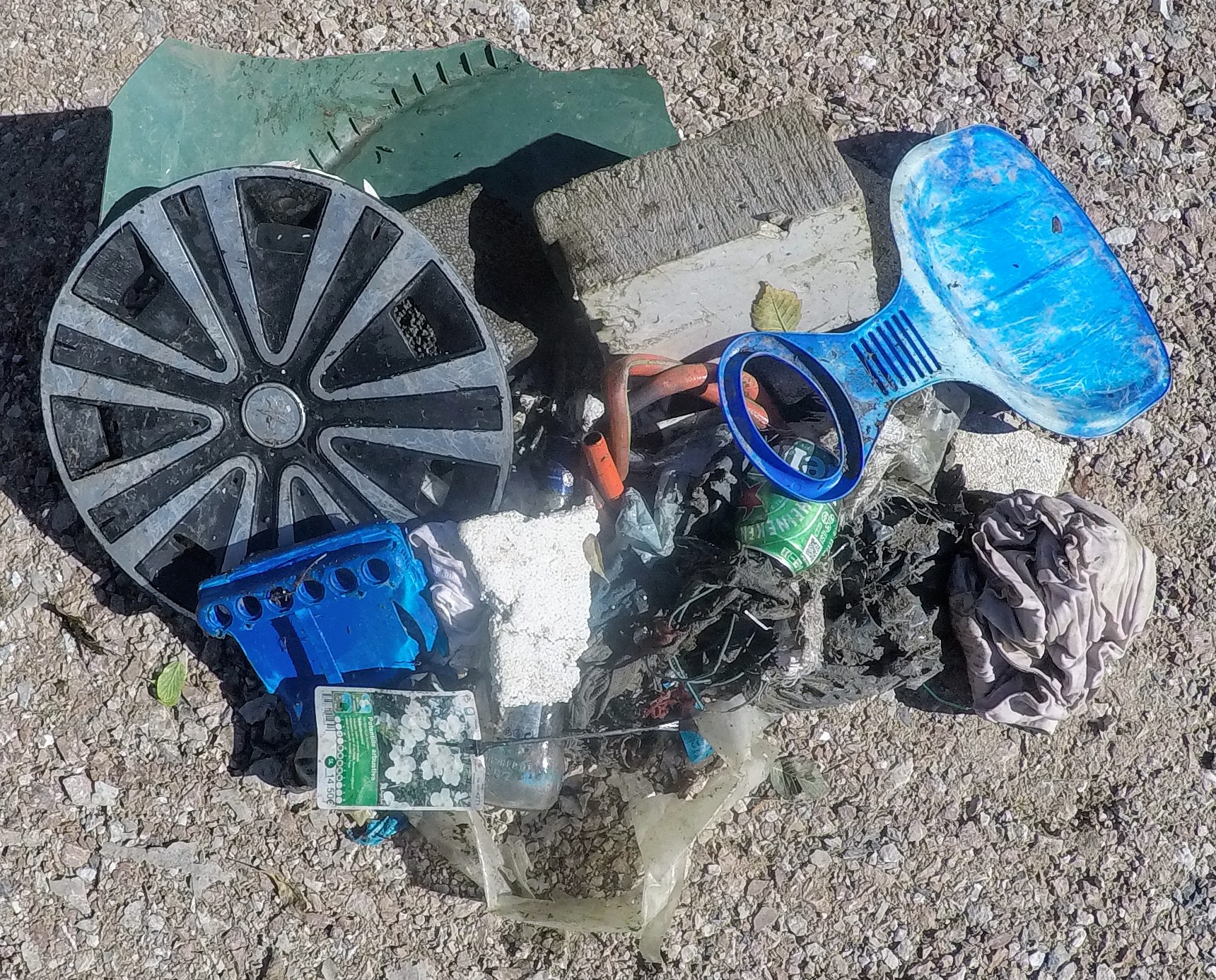 Chambre à air.Courroie.Ski.Bouteille d’eau 5 litres.Divers déchets.Ballon.