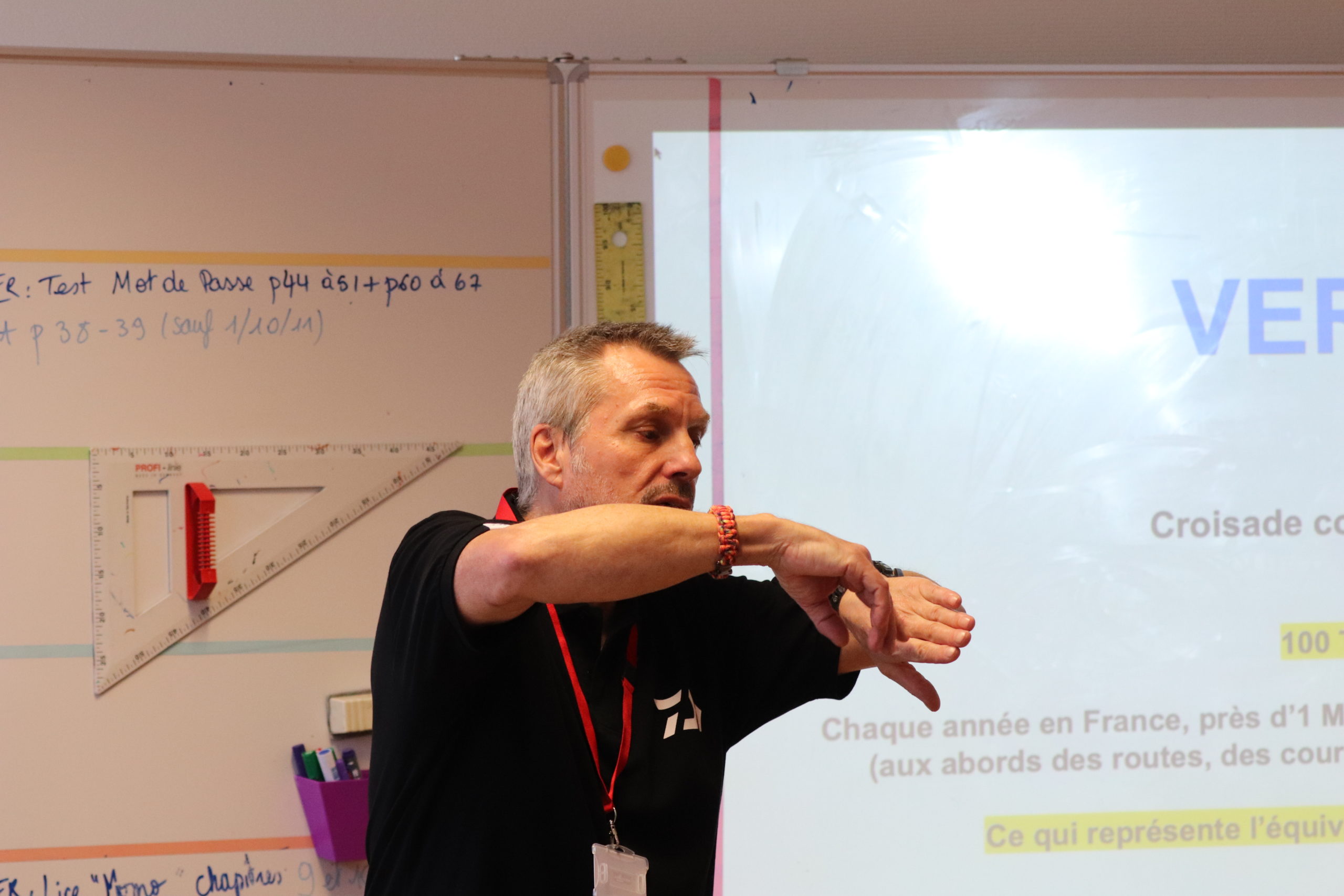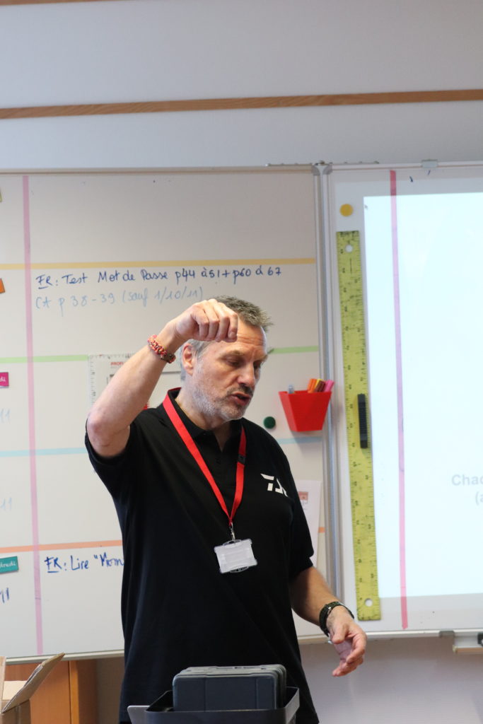 avec cinq classes réunies, suivie d’un débat dans chacune d’entre elles. Un grand merci à Mme Geraldine Boland (directrice), Mme Sandrine Figaroli (mise en relation et institutrice), ainsi que Mme Noa Coigny (communication). Pour les photos de moi ci-dessous, Noa a su capter toute mon énergie, joignant le geste à la parole, tel un maître de Kung Fu